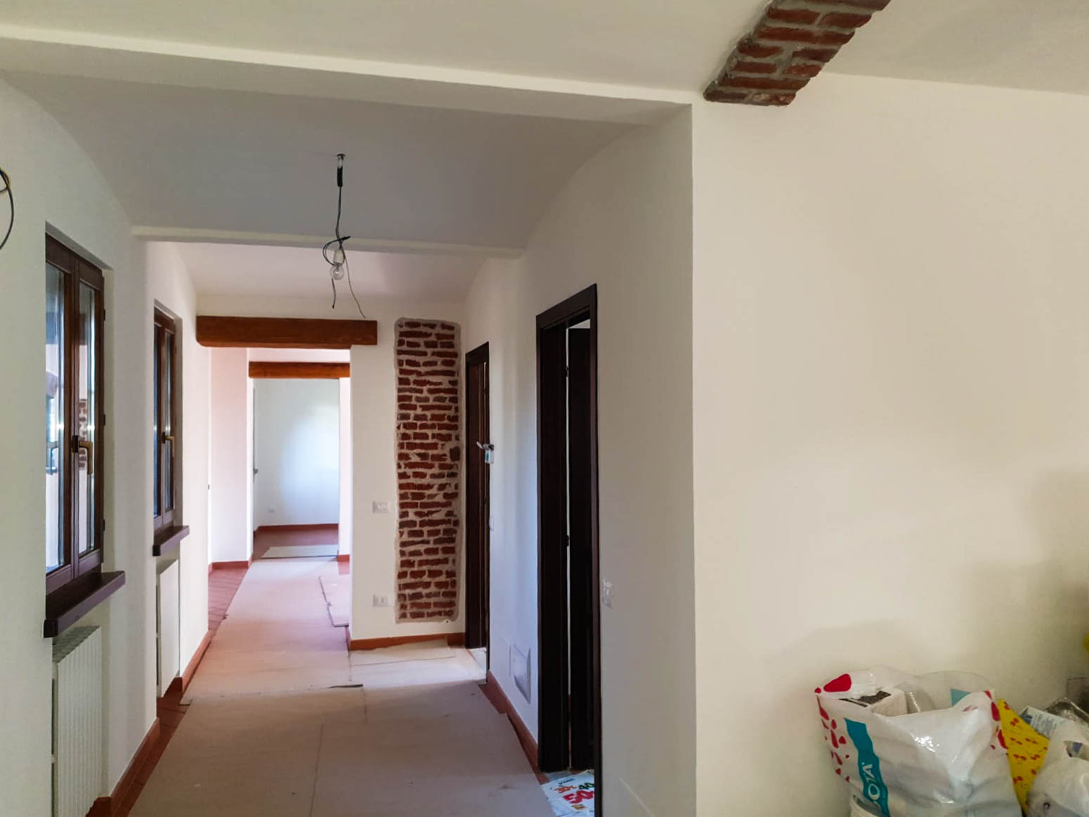Il corridoio con archi ribassati, mattoni a vista e travi in legno crea una continuità visiva tra i diversi ambienti, accompagnando lo sguardo verso le stanze principali. L’impiantistica è stata completamente rinnovata, garantendo comfort ed efficienza senza alterare l’estetica originale.