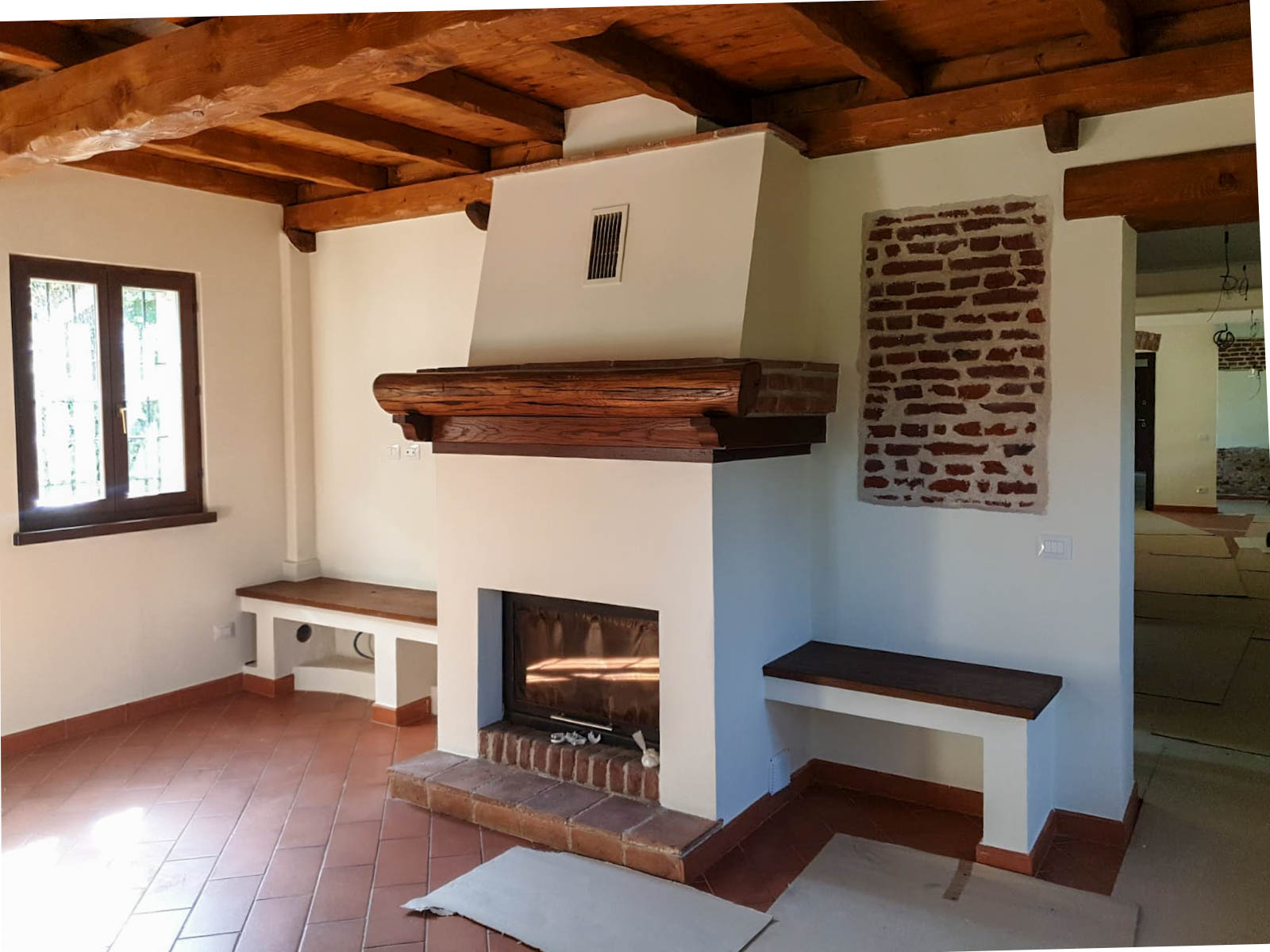 Nel reparto giorno, il camino centrale rappresenta un vero fulcro visivo: completamente ricostruito e rifinito con legno massello e inserti materici, combina tradizione e funzionalità. Le panchine murate e gli elementi su misura completano la scena, richiamando l’estetica delle antiche case di campagna.